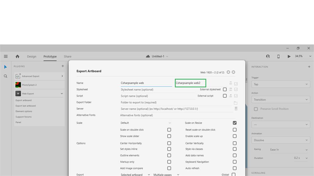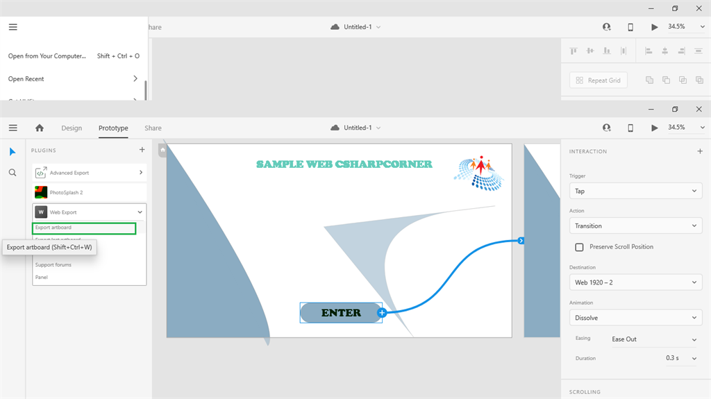 For exporting the design into the webpage you can use the web export plugin. Under the web export plugin there will be an option called export artboard which is the option for exporting the entire artboard. During that export the artboard will be exported as html file. By clicking that it will display a window with an export option.