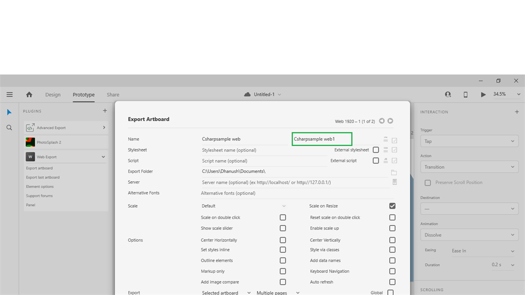 Then click the advanced option which is available in the bottom of that window. That will display a lot of options for exporting the artboard. There you can choose the destination for export and the name for the exported file.