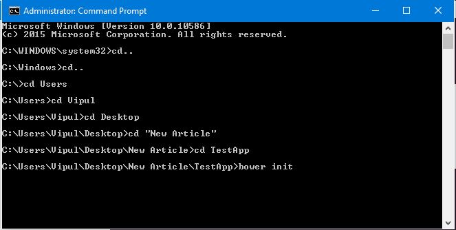 We need to have a bower file in our project. In order to get that, open Command Promt at the project directory location and use the command bower init. This will create a bower file in your project with the required details.