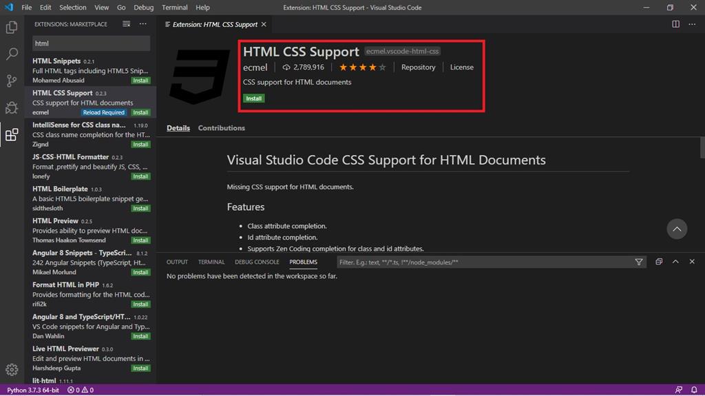 Extension panel gets opened. Under the search just type HTML. You find an extension named HTML CSS support as a second one among the list. Just install that extension.