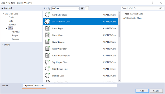 BlazorSPA.Server/Controllers folder and select Add >> New Item. An “Add New Item” dialog box will open. Select