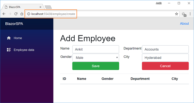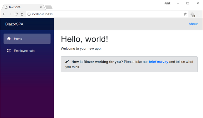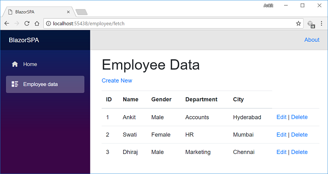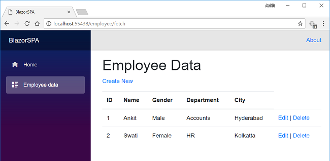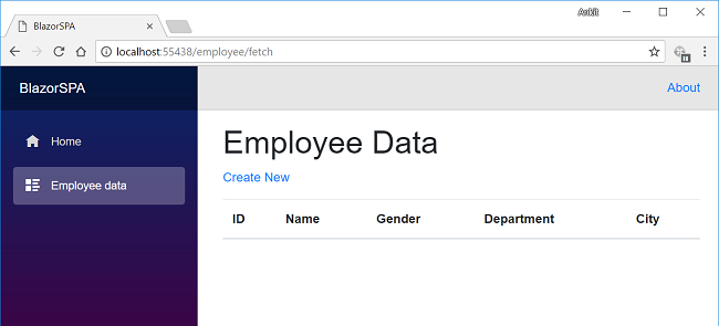 The last step is to add the link to our “EmployeeData” page in the navigation menu, open BlazorSPA.Client/Shared/NavMenu.cshtml page and put the following code into it.