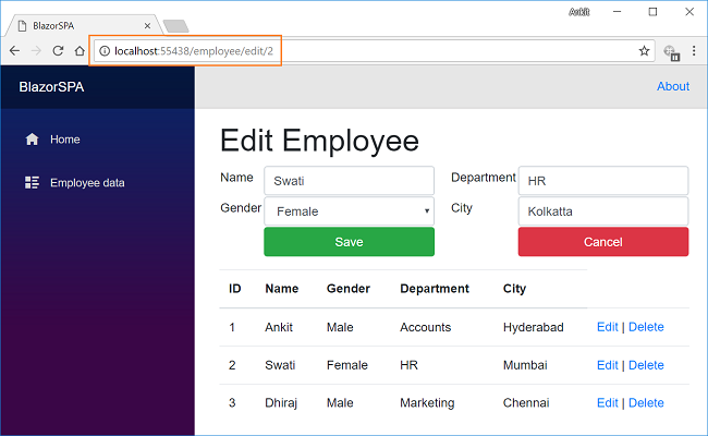 If we want to edit an existing employee record, then click on Edit action link. It will open Edit view as shown below. Here we can change the employee data. Notice that we have passed employee id in the URL parameter.