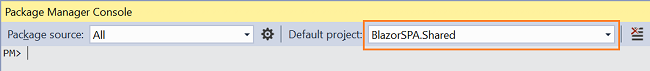 Navigate to Tools >> NuGet Package Manager >> Package Manager Console. Select “BlazorSPA.Shared” from Default project drop-down. Refer to image below,