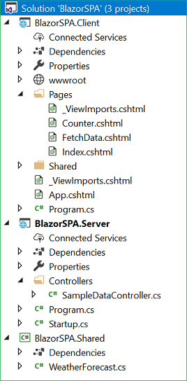 Now, our Blazor solution will be created. You can observe the folder structure in Solution Explorer, as shown in the below image.