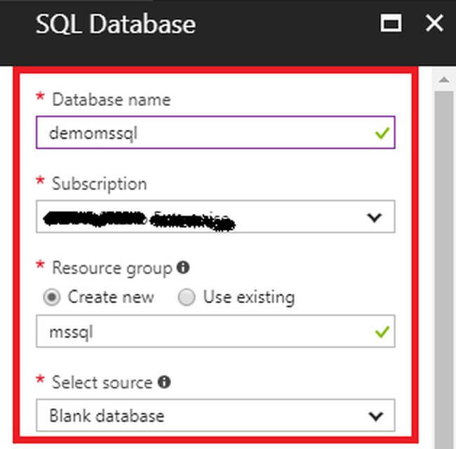 Enter the SQL Database name, choose the subscription, and create a new Resource Group for the database, named as mssql. Then, select the Data Source as Blank Database.