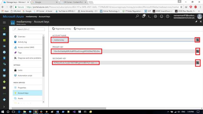 Now we need the account name with the primary keys information to process the media and for it, in the Media Service Window, select ->account keys. The account name with the primary and secondary key will be displayed and copy the keys to Notepad for the further use.