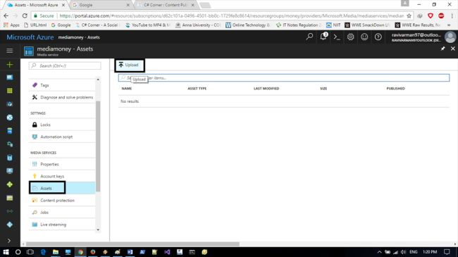 Now we can upload the files into AMS. In Media Service, we can upload the files to the asset, the asset contains the audio files, video files and images etc. After uploading the content, it is stored in an Azure storage.