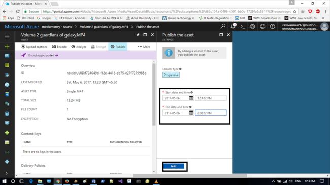 From the encode asset Window, select Media encoder standard for encoding and after encoding the file, we can publish the asset file by providing the locator type with start and end time with the date. Afterwards, select Add.