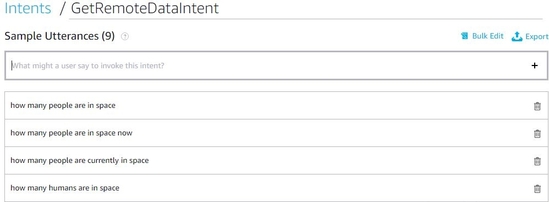 Here, I have added a new intent named GetRemoteDataIntent along with some sample utterances such as how many people are in space, how many people are in space now, and how many people are currently in space. No slots and custom slot types are defined for this Alexa skill.