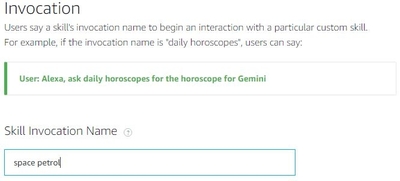 First, we need to mention the invocation name. Users say a skill's invocation name to begin an interaction with a particular custom skill.