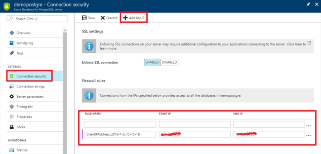 Then, we want to configure the firewall to connect to our client PC. By default, it rejects the connection to the server and the database. Click connection security and then click "Add My IP" to add our IP to PostgreSQL Server. Click the save button and then our IP is shown under the Firewall rules.