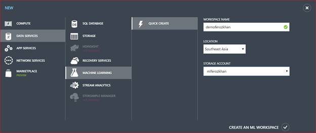 Click New - Data Services - Machine Learning - Quick Create - Workspace name, Location and Storage Account. Click Create an ML Wokspace.