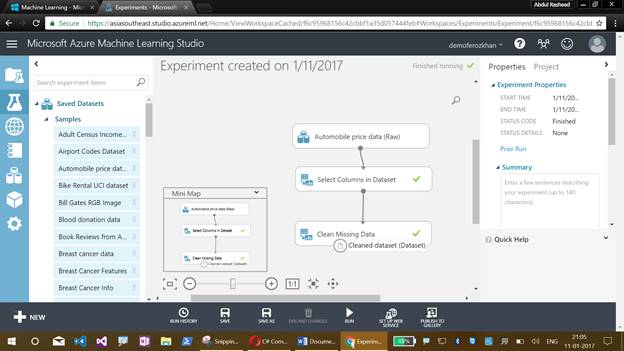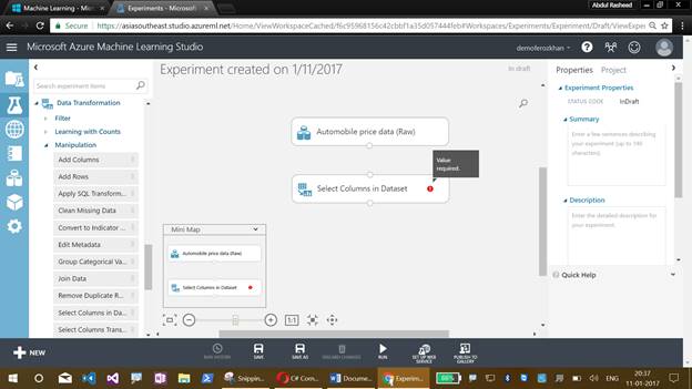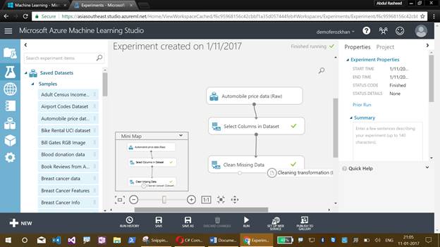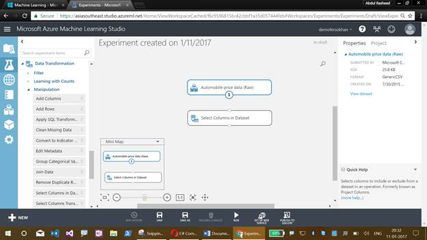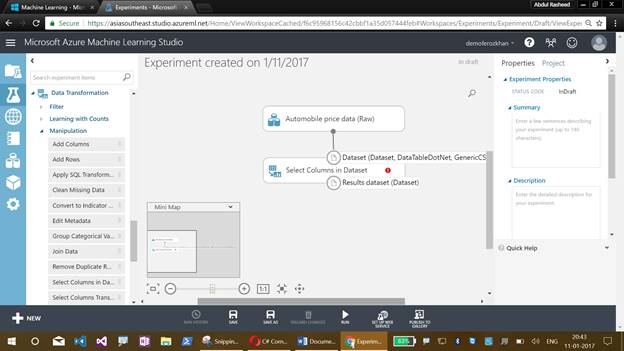 Now comes the graphical display of our Azure Machine Learning Studio experiment, which will help us to drag the items. This also illustrates the flow of an experiment.