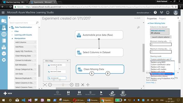 We do this with the Clean Missing Data, so let's drag it off to the Workspace and connect it to the datasets in the column.