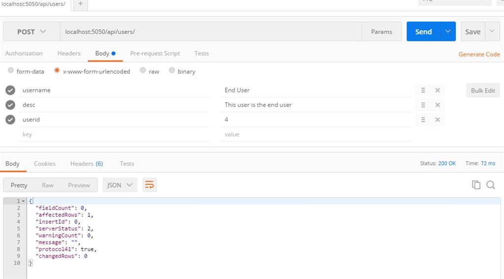 - con.query('INSERT INTO users (UserID,UserName,Description) VALUES(?,?,?)', [req.body.userid,req.body.username, req.body.desc], function (err, rows) {