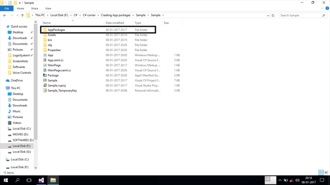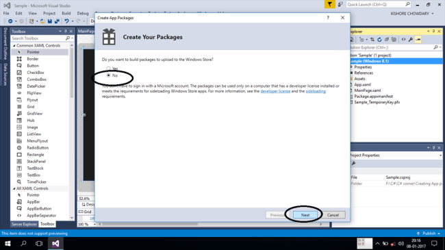 Let us assume that the below given screenshot is the completely developed application. Now, the first step is to right click on the name of the project and select the Store menu. Now, a small menu pops up. Select the "Create App Packages..." option. The following is explained in the screenshot below.
