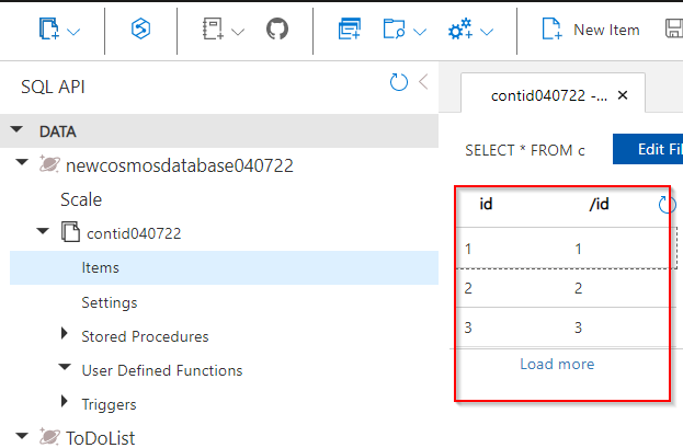 To add a new Item, you can create from the same Data Explorer tab and then use the sample query as given below.