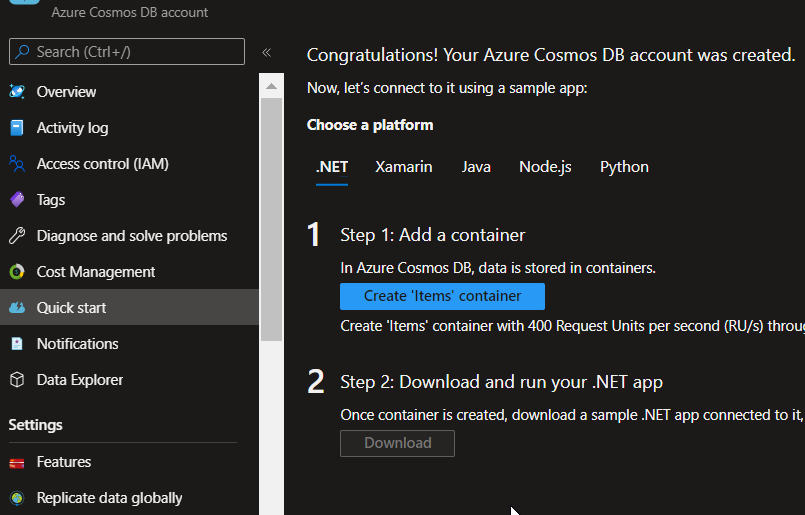 The Quick Start page is the first you will see once you have created the CosmosDB resource. You can add a container where the data will be stored, the container can handle 400 request units per second throughput. But for now, we will not create the container here, I will show where this can be done manually which will have the option to change the RU/s as per our need.