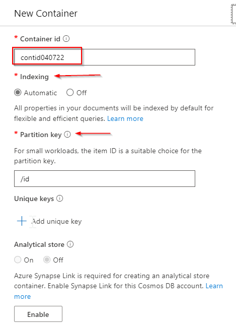 Provide unique name for the DatabaseID and other options like automatic index all data to gain performance access and the partition key that can be used for logically partitioning within the same container.