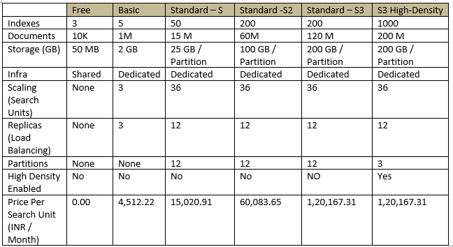 | Pricing Tier  | In this example, I have chosen Standard – S1 tier. Unlike App Service Plan’s tiers, you CANNOT do in-place updating of the pricing tier of the Search Service. In case you want to scale-up from Free to Standard, you need to re-create everything and migrate the index data (We will discuss more about indexes in the upcoming articles). |