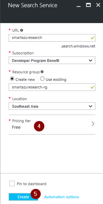 Clicking on the Azure Search, you will be taken to the following "New Search Service" blade.