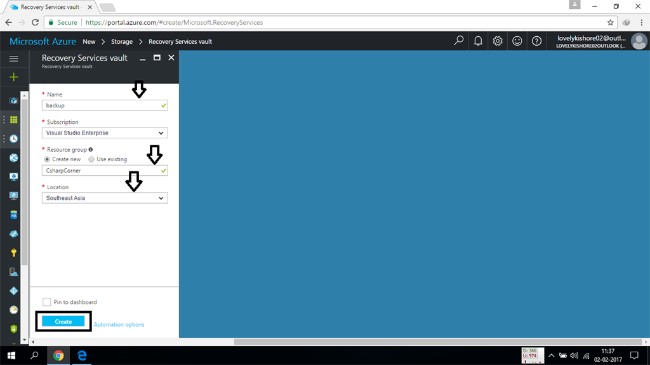 - In a new window, you will be asked to enter your vault name, resource group, and the location. Once you select all these, click on the "Create" button.