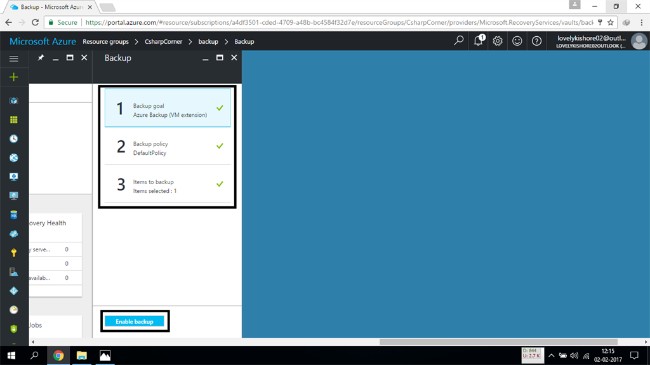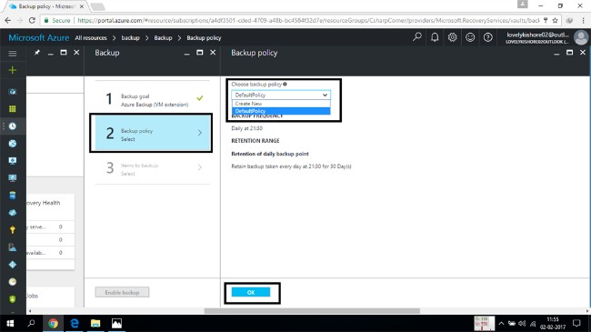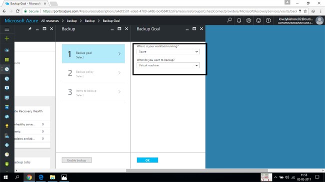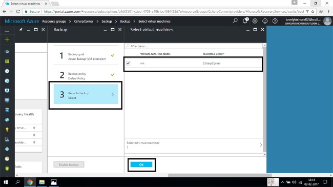 - Finally, in the items for backup, choose the VM which you have already created in the Azure portal and then, click on the "OK" button. This will verify all the credentials.