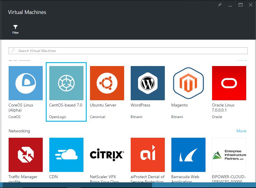 In the virtual machine blade, click to see all options on the above and the following Windows appears. On it, select Cent OS, provided by OpenLogic.