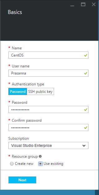 - In the basic configuration wizard, fill in the mandatory information such as name of the virtual machine, Username, Password, Resource group and click Next.