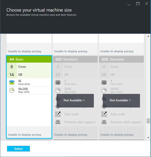 - In the virtual machine size wizard, select the size of the virtual machine, you want to create.