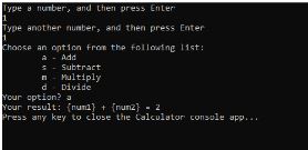 - Console.Write("Press any key to close the Calculator console app...");
