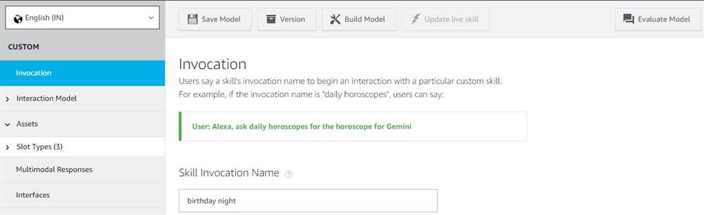 First we need to mention the invocation name. Users say a skill's invocation name to begin an interaction with a particular custom skill.