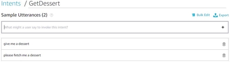 Here, I have added a new intent named GetDessert along with some sample utterances such as give me a dessert, please fetch me a dessert. No slots and custom slot types are defined for this Alexa skill.