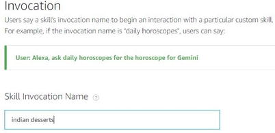 First, we need to mention the invocation name. Users say a skill's invocation name to begin an interaction with a particular custom skill.