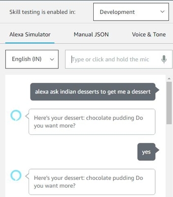 As we can see from the output above, to invoke a skill, the user can say Alexa followed by invocation name and sample utterance. Here Indian desserts are an invocation name to invoke this skill and get me a dessert is a sample utterance defined for the skill. Once the skill is invoked, Alexa tells the user a random dessert name and also asks the user if he/she wants to know about any more desserts.