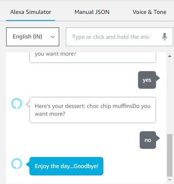 Each time, Alexa asks if the user wants to fetch anymore dessert. The users can give a response by saying yes or no accordingly. If a user responds by saying no, then Alexa will prompt a goodbye message. The backend code required for the Alexa skill to work will be stored in a lambda function inside the Amazon developer console.