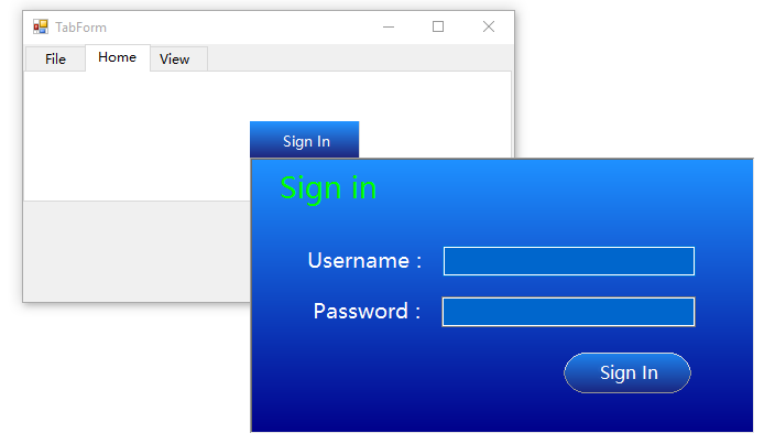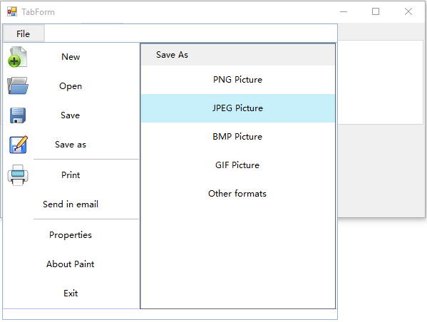 Actually, it is a TabControl, we all know. You can see that old Microsoft Office packages, like 2007,2010 etc. provided the RibbonBar with DropDownControl. Here, we already created our own DropDownControl. Now, it's the time to display DropDownControl with Tab. This can be achieved by setting first tab of TabControl (means index 0) to fixed for File option. Perform all the above actions except Step 5. Replace Step 5 to the following:
