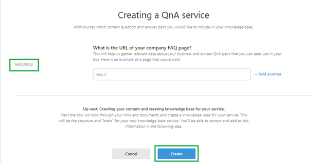 This will help us gather relevant data about your business and extract QnA pairs that you can later use in your bot. Now this is really cool, we can enter one or more URLs to existing, publicly accessible, FAQ style pages; Assuming or considering the URL are with “FAQ” type HTML structure, QnA Maker service can extract the Qs and As crawling into the same.