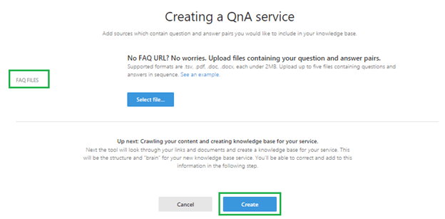 Hitting on ‘Create’ will lead to this neat message, saying QnA is extracting URLs for feeding data. Now, the time taken for this could vary with size and number of URLs you are entering.