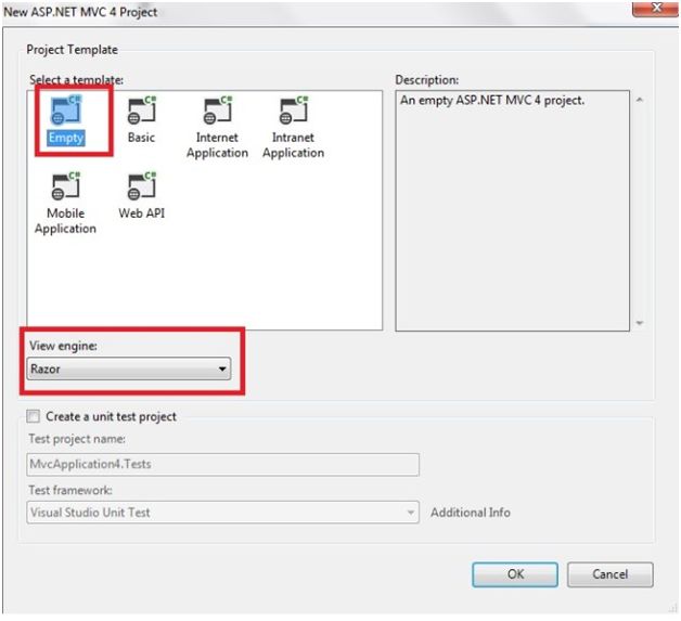Step 3: Select Empty template as we do not want pre generated code and class files as of now. We will be using Razor Engine so it is auto selected and need not be changed. Click OK.