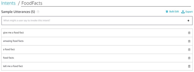 Here, I have added a new intent named FoodFacts along with some sample utterances such as give me a food fact, tell me a food fact. No slots and custom slot types are defined for this Alexa skill.