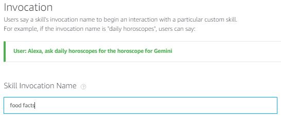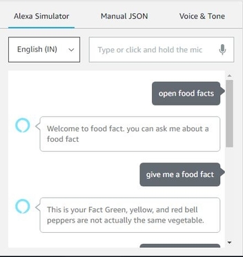 As we can see from the output above, to invoke a skill, the user can say open followed by invocation name. Here food facts is an invocation name to invoke this skill. Alexa then greets the user by saying welcome to food fact and tells the user that he/she ask Alexa about random food facts.