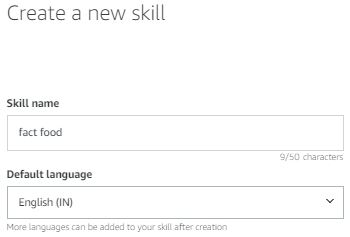 To create a new skill, first we need to login to the Alexa developer console. Then, we need to mention the unique skill name and select the default language according to our location.