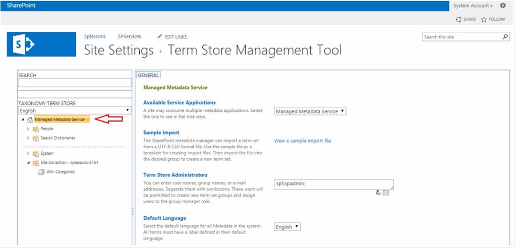 Step 5You will enter into the term store management tool and on the left hand side, you can see Taxonomy Term Store.