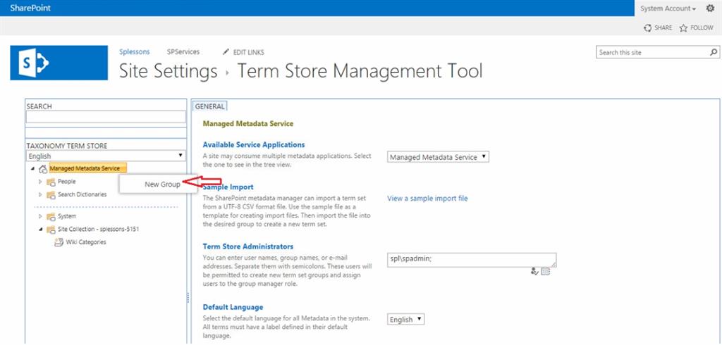 Click Managed Metadata Service and New Group menu appears- > Click New group.