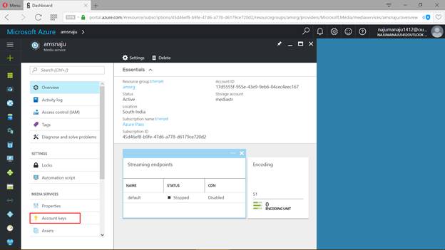 You can find the Account name, Primary key and Secondary key over here which you can use for connectivity towards Media Services.