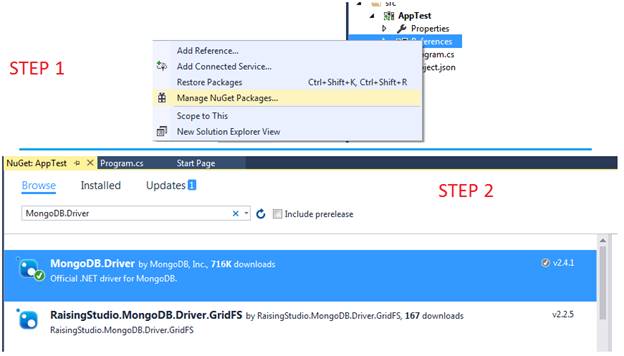 - Right click on reference to get NuGet Package Manager to get the driver to get connectivity with MongoDB. In "Browse", search for MongoDB.Driver driver and install it. For this example, I am using version 2.4.