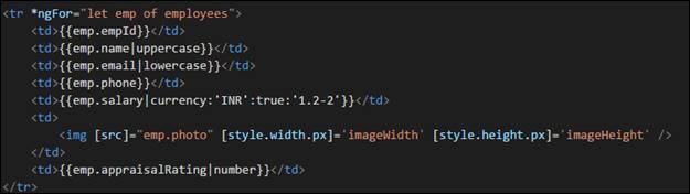 We’ll format our employee name in upper case, E-mail in lower case & salary in currency. Below are the changes made in emp-list.component.html.