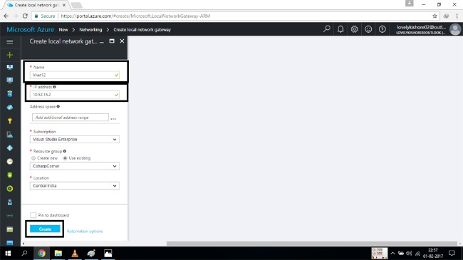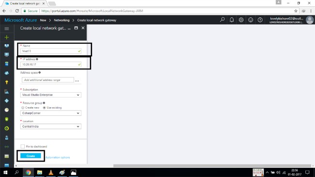 Once you click on it, you will be see a new window which will ask for your local gateway network name, IP addresses range, and the location along with the subscription.